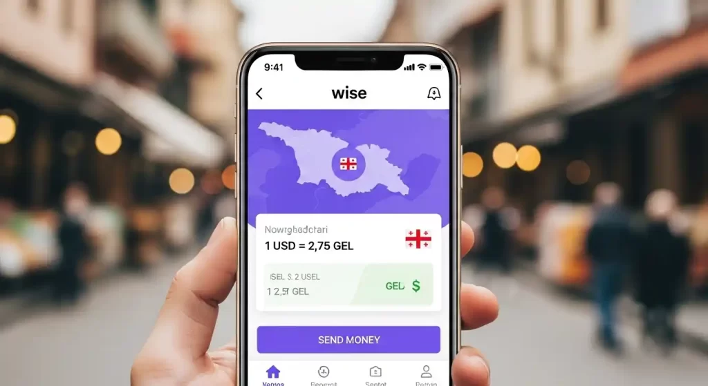 Wiseのアプリで「送金」を選び、送金元を「日本円(JPY)」、送金先を「ジョージア・ラリ(GEL)」に設定します。送りたい金額(日本円で指定するか、GELで指定するか選べます)を入力すると、手数料と為替レートが自動で計算され、相手にいくら届くかが正確に表示されます。
