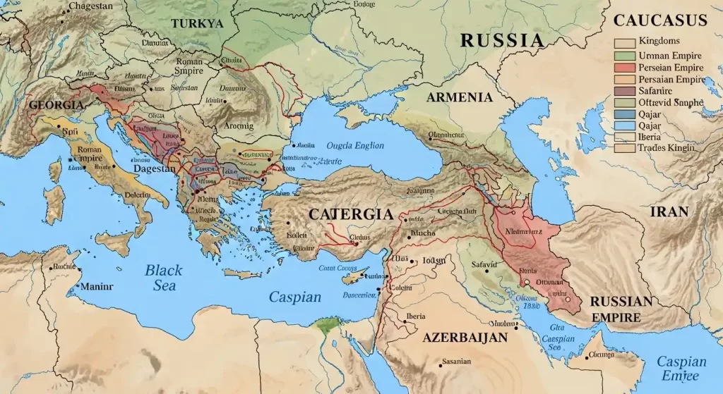 歴史時代に入ってからも、カフカスは常に大国間の覇権争いの舞台となってきました。古代にはローマ帝国とペルシャ帝国、中世にはビザンツ帝国、アラブ、モンゴル帝国、そして近世以降はオスマン帝国、ペルシャ(イラン)、そしてロシア帝国がこの地の支配を巡って激しく争ったのです。